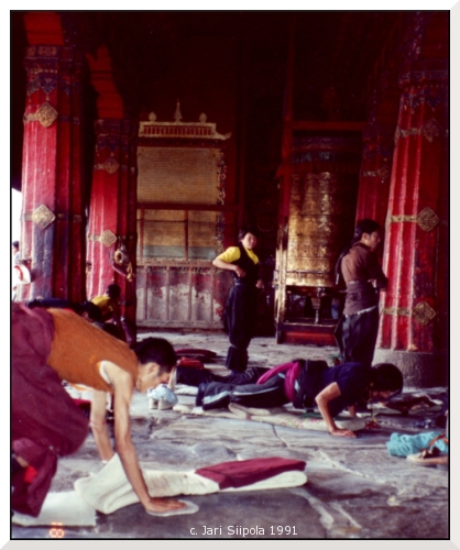 Prostraayion harjoittajia Jokhang temppelin edustalla, Lhasa'ssa.